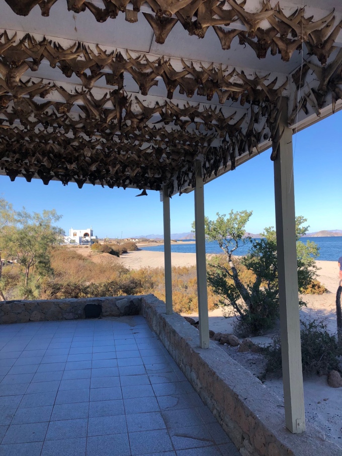After mildly frustrating myself with the internet, but being happily full of tacos, we headed back to camp. We decided to take a shortcut down a sandy track in order to avoid a large hill on the road, which was also a much longer route. This had mixed results, the road tyres on my bike aren’t very good in sand and I don't have suspension which would have been nice on the washboard road. We had no idea which of the many tracks we should take, and couldn't look it up as we had no signal. The result was us ending up in what I think is an abandoned military base, and walking the bikes some of the way through some deep sand and appreciating all these dead fish tails that have been exquisitely nailed to the ceiling.