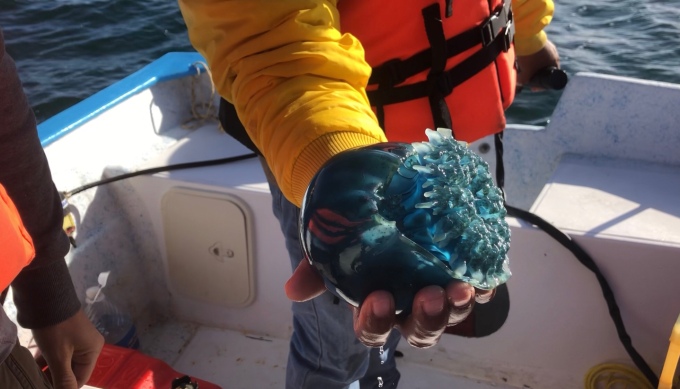 We pottered around in the vicinity, sometimes around a 100 yards or so from a whale before it headed off away from us. The sea around us was full of bright purple jelly fish as we coasted along.