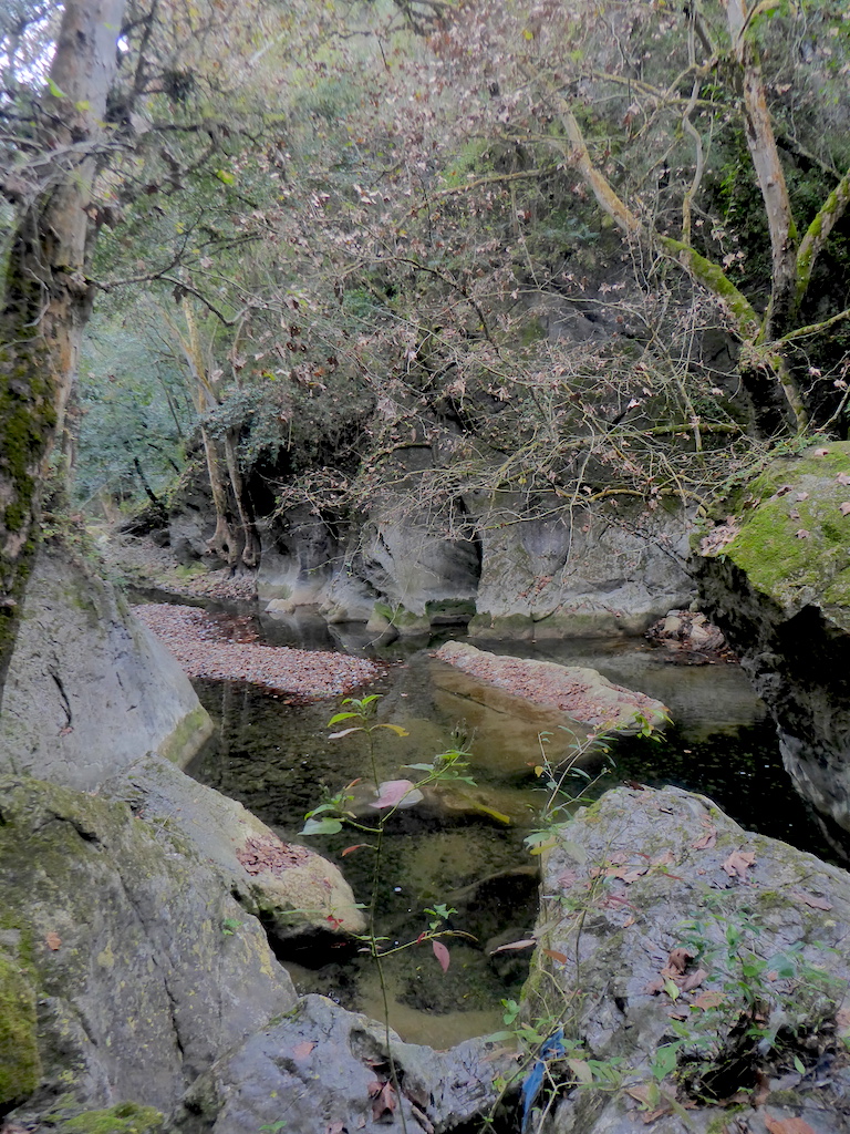 We continued on. The trail was not particularly long, but the last section is a steep downhill descent from the ridge of the hill to the river in the valley below. We bemoaned the fact we needed to go back up as we scrambled downwards. Jaro was a way ahead of us at this point and we lost him completely. At the bottom we ran out of path at the river. A fairly non-descript pile of rocks was to the right. Climbing around these a bit revealed a bit of an entrance, still nothing particularly interesting.